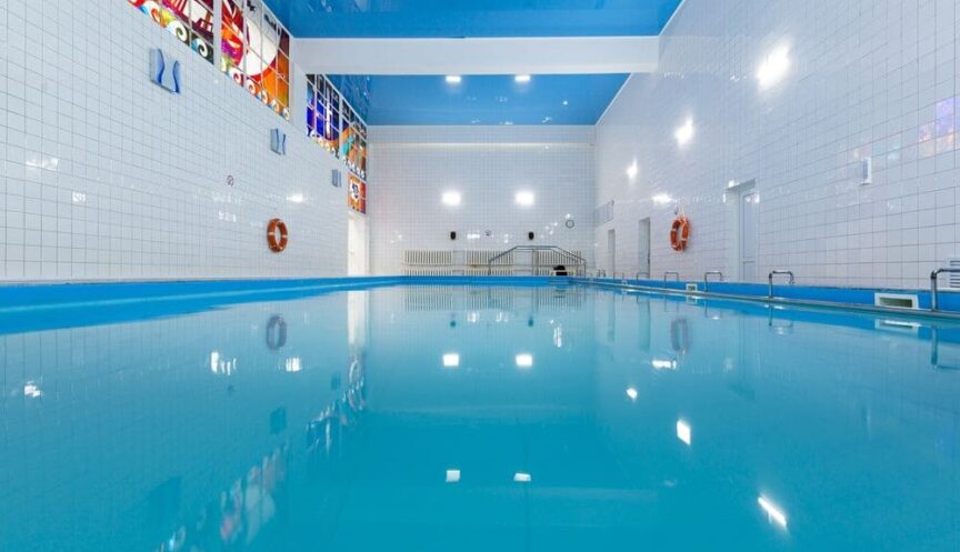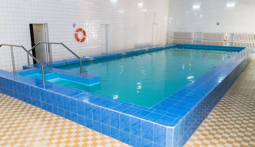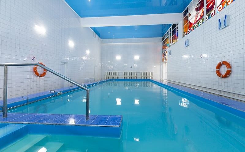 Крытый бассейн 12×8 метров. Здесь проходят занятия аквааэробикой.